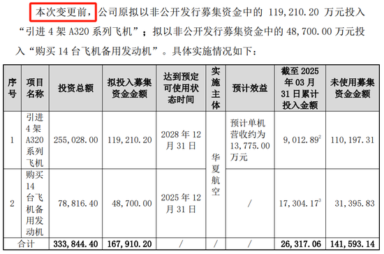这笔募集资金是2022年进行的。当时华夏航空定增募资24.35亿元,扣除发行费用后的募集资金净额拟全部用于引进4架A320系列飞机,购买14台飞机备用发动机和补充流动资金。