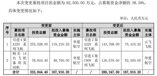 同时,终止原募投项目“购买14台飞机备用发动机”,拟投入募集资金金额为4.87亿元。上述变更涉及金额合计9.25亿元,占募集资金净额的38.39%,调整后的资金将用于新募投项目“引进5架C909系列飞机”。