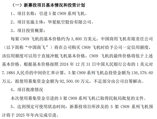 公告显示,每架C909飞机的基本价格约为3800万美元,中国商飞将在华夏航空购买C909飞机时给予公司一定信用额度,该信用额度可以用于直接冲抵飞机基本价格,C909飞机的最终价格将低于上述基本价格。新募投项目“引进5架C909系列飞机”总投资金额为13.66亿元,拟使用募集资金金额为9.25亿元,不足部分由公司自筹解决。5架C909系列飞机预计将于2025年年内完成引进。